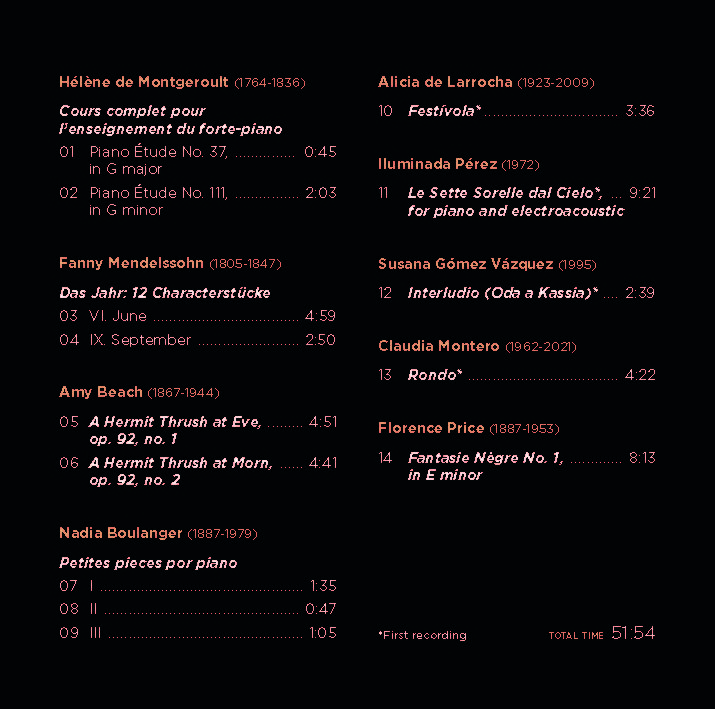 In a way, the Pleiades are metaphorically embodied by the composers who feature on this album: Montgeroult, Mendelssohn, Beach, Larrocha, Boulanger, Price, Montero, Pérez and me.